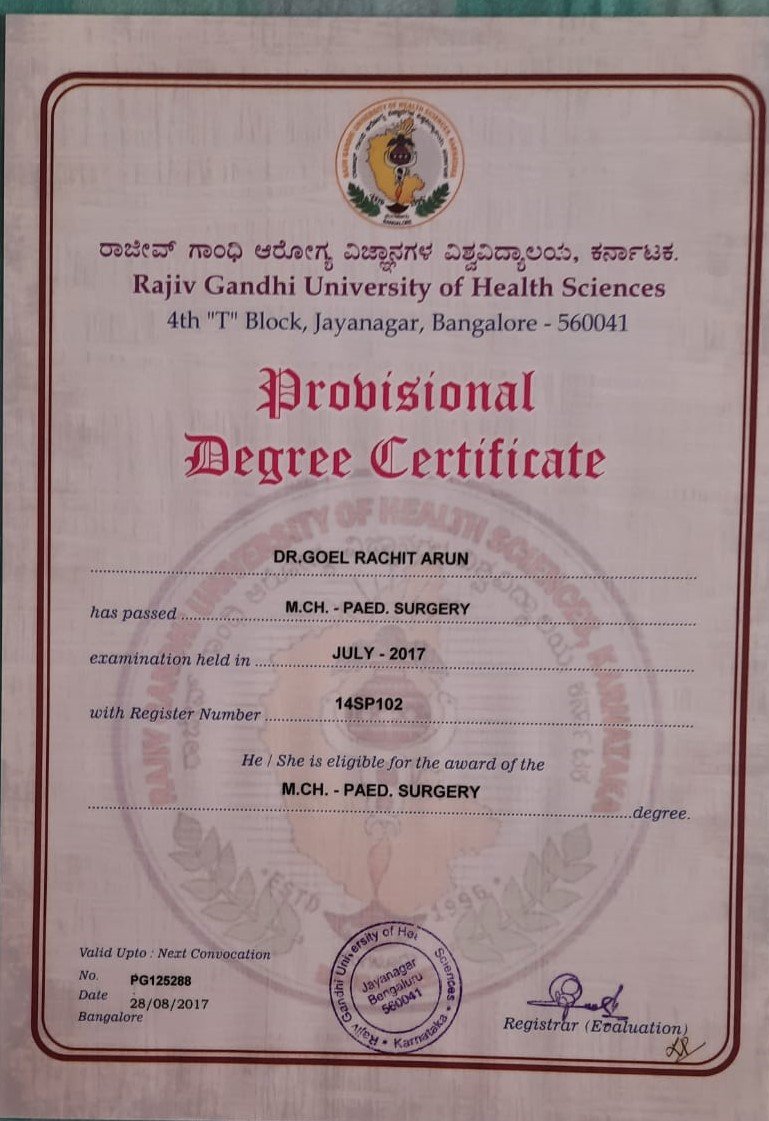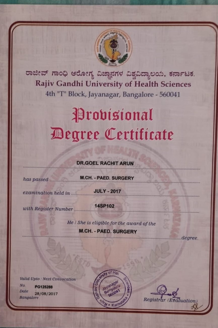 Dr. Rachit completed his MBBS from Government Medical College, Miraj, followed by DNB in General Surgery at Jehangir Hospital, Pune. He then pursued MCh in Pediatric Surgery from the prestigious Indira Gandhi Institute of Child Health, Bangalore.